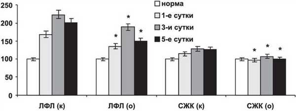 Формирование синдрома эндогенной интоксикации сопровождалось модификацией функционально-метаболических параметров печени, что проявилось накоплением в крови продуктов азотистого обмена, билирубина, «печеночных» ферментов и кишечника: проницаемость сосудов микроциркуляторного русла кишечника для воды и белка была повышена, коэффициент диффузии кислорода снижался на 27,9-58,1% (p<0,05), электрогенез уменьшался на 25,1-68,0% (p<0,05).