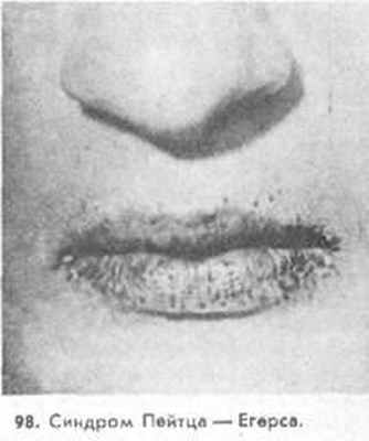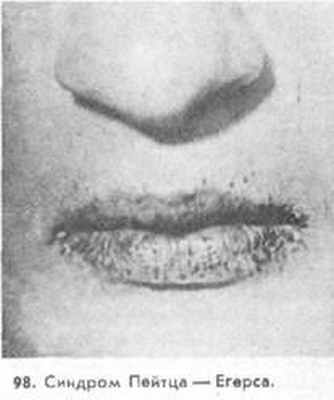 Периорифициальный лентигиноз (син.; синдром Пейтца — Егерса). Тип наследования аутосомно-доминантный. Этиология и патогенез заболевания изучены недостаточно. Клиническая картина характеризуется появлением сразу после рождения или несколько позже высыпаний типа лентиго, веснушек на слизистой оболочке полости рта (щеках, деснах, твердом небе), губах, а также на коже лица вокруг рта (рис. 98), в области заднепроходного отверстия, реже на кистях и стопах. Иногда наблюдается гиперпигментация ногтей. Позднее (в возрасте 10—30 лет) развивается полипоз кишечника (чаще тонкой кишки) и желудка в виде аденоматозных гамартом, склонных к озлокачествлению. Клинически отмечаются боли в кишечнике, кровь в кале, возможны кризисы с кишечной непроходимостью, вторичная анемия, кахексия. Возможна дистрофия волос и ногтей.
