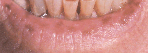 Лентиго бывает врожденным или появляется в грудном и младшем детском возрасте. Пятна на губах со временем могут исчезнуть, но пигментация слизистой рта сохраняется на всю жизнь — без этого признака нельзя поставить диагноз. Лентиго обнаруживают и в отсутствие полипоза ЖКТ.