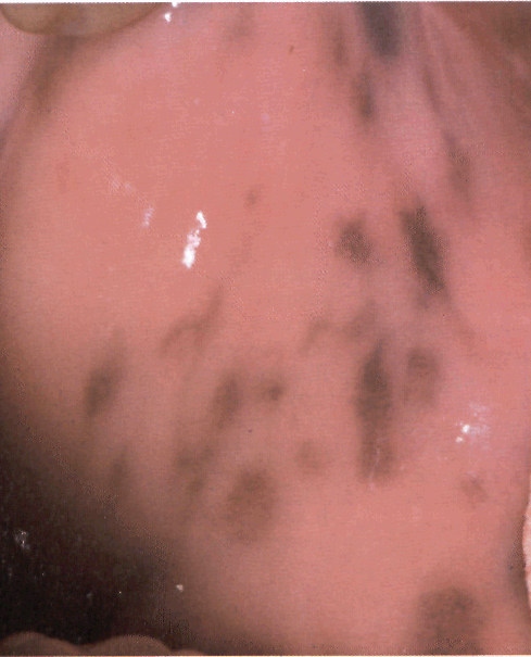 Обязательный признак синдрома Пейтца— Егерса — пятна коричневого, черного или иссиня-черного цвета, беспорядочно рассеянные на деснах, слизистой щек и твердого неба.