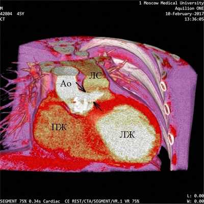 Предоперационное эхокардиографическое исследование выявило аневризму правого коронарного синуса с прорывом и формированием аорто-правожелудочковой фистулы, комбинированный аортальный порок с выраженным кальцинозом, тяжелым стенозом и недостаточностью, гипертрофию и дилатацию левого желудочка (конечный диастолический объем — 300 мл), снижение глобальной сократимости левого желудочка (фракция изгнания — 37%) на фоне диффузного снижения локальной, тяжелую трикуспидальную недостаточность, тяжелую легочную гипертензию. Порок сердца подтвержден данными МСКТ (см. рисунок). При КТ-коронароангиографии поражения коронарного русла не обнаружено. От проведения дооперационной терапии левосименданом мы вынуждены были отказаться по причине наличия у пациента частой желудочковой экстрасистолии и пробежек желудочковой тахикардии по данным мониторирования ЭКГ по Холтеру.