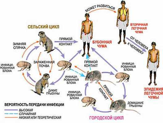 Чума встречается прежде всего у диких грызунов (например, крысы, мыши, белки, луговые собачки) и передается от грызуна человеку укусом зараженной блохи. Чума также может распространяться при контактах с жидкостями или тканями инфицированного животного.