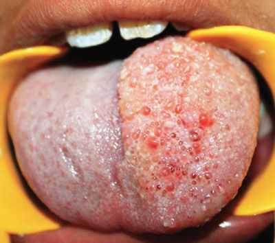 Лимфангиома языка характеризуется наличием большого количества мелких пузырьков, которые возвышаются над поверхностью слизистой, сливаются и образуют узел. При травмировании пузырьки вскрываются, кровоточат и покрываются белым налетом. На их месте образуются трещины и язвочки, покрывающиеся со временем белесовато-желтоватыми и кровянистыми корочками. Диффузная форма патологии отличается распространением патологии на мышечную ткань языка. У больных развивается макроглоссия. Язык становится большим и толстым, плохо помещается в полость рта. У больных постоянно открыт рот, нарушается прикус, возникает диспноэ, дисфагия и дисфония.