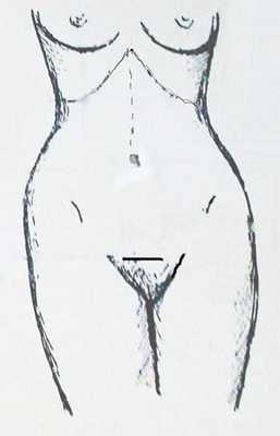 14.05.2010 пациентке Н. под ЭТН выполнена лапаротомия. Перед бригадой стояла задача найти рациональный оптимальный доступ в брюшную полость. Ориентиром были точки костных образований: crista iliaca anterior superior, которые были значительно выше точки пупка из-за перерастяжения передней брюшной стенки и свисания его в виде фартука. При лапаротомии был выбран верхнесрединный разрез выше пупка на протяжении 20 см по длиннику по выбухающей части опухоли. На размере отмечается повышенная инфильтрация передней брюшной стенки, выраженная лимфорея подкожной клетчатки. В операционную рану предлежит капсула опухоли, местами подрастающая к брюшине передней брюшной стенки. Опухоль многокамерная, с неровной поверхностью, гигантских размеров, исходящая из правых яичников, выполняла всю брюшную полость (50х70 см). Содержимое опухоли- жидкость муцинозного характера, бурого цвета. Опухоль удалена, направлена на срочное гистологическое исследование. Гистологический результат: цистаденома низкой степени злокачественности. Окончательный ответ после проводки. При ревизии органов брюшной полости: печень гладкая, л/узлы не увеличены. Кишечник, б/сальник не изменены. Матка до 8 нед., плотная. Левые придатки не увеличены.