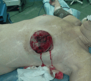 Справа – злокачественная листовидная опухоль. Из-за быстрого роста опухоли перерастянутая кожа некротизируется. Удаление молочной железы производилось вместе с удалением большой грудной мышцы, поскольку опухоль врастала в неё.