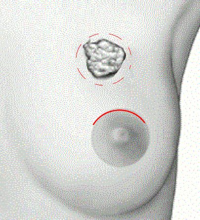 На схеме изображена секторальная резекции при доброкачественной листовидной опухоли, пунктиром показан объём удаляемой ткани.