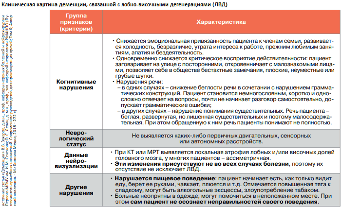 статья «Эмоциональные, аффективные и поведенческие нарушения при поведенческой форме лобно-височной деменции» Д.А. Гришина, Н.Н. Яхно, В.В. Захаров; ФГАОУ ВО «Первый Московский государственный медицинский университет им. И.М. Сеченова» МЗ РФ, Москва (Журнал неврологии и психиатрии, №11, 2017) [читать];