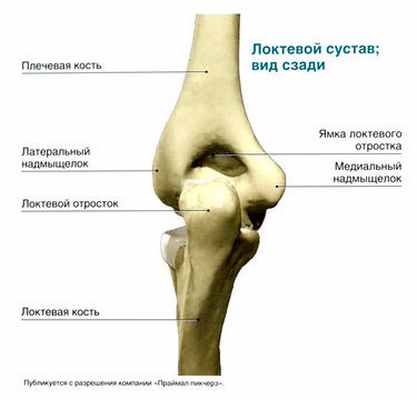 Локтевой сустав — это сочленение трех костей: плечевой, локтевой и лучевой. Плече-локтевой сустав относится к блоковидным, его образуют блок медиального мыщелка плечевой кости и полулунная вырезка локтевой кости. Увеличению площади суставной поверхности способствуют локтевой и венечный отростки, углубляющие полулунную вырезку. Плечелучевой сустав образован головкой лучевой кости и головкой мыщелка плечевой кости. Сустав между локтевой и лучевой костями образован головкой лучевой кости и лучевой вырезкой локтевой кости. Эти суставы вместе со связочным и мышечным аппаратом обеспечивают сгибание и разгибание в локтевом суставе, а также пронацию и супинацию предплечья.