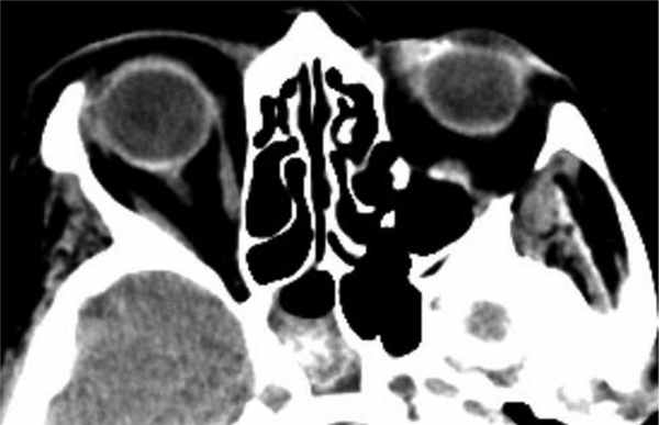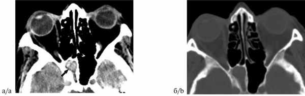 В норме на КТ- и МР-изображениях в аксиальной проекции на уровне глазницы хорошо дифференцируются полость носа, носовая перегородка, внутренние и наружные стенки глазницы, жировая клетчатка глаза, глазное яблоко, зрительный канал, клиновидная пазуха, носовая кость, венечный отросток нижней челюсти, турецкое седло, височная мышца, латеральная крыловидная мышца, носоглотка, ветвь нижней челюсти. На срезе, выполненном на уровне обеих верхнечелюстных пазух и носоглотки, хорошо визуализируются полость носа с перегородкой и раковинами, внутренние и наружные стенки глазниц, передненаруж-ная стенка верхнечелюстной пазухи, височная мышца, клиновидная пазуха, перпендикулярная пластинка решетчатой кости, медиальная и латеральная крыловидные мышцы, венечный отросток нижней челюсти, жевательная мышца, околоушная железа, устье слуховой трубы. На томограммах во фронтальной плоскости, сделанных на уровне передней, средней и задней трети глазницы, выявляются головной мозг, стенки глазницы, глазное яблоко, полость носа, верхнечелюстная пазуха, твердое небо, жевательная мышца, медиальные прямые мышцы глаза и зрительный нерв.