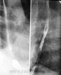 Процесс прохождения глотков бариевой взвеси (или специального бариевого препарата) регистрируют с помощью флюороскопии в реальном масштабе времени. Частое показание к рентгенологическому исследованию пищевода - диагностика желудочно-пищеводного рефлюкса. Он проявляется обратным забросом бариевой взвеси из желудка в пищевод при исследовании в горизонтальном положении или в положении Тренделенбурга. В случае обструкции пищевода инородным телом рентгенологическое исследование позволяет немедленно установить его уровень и выраженность. С помощью этого метода хорошо видны участки расширения и сужения пищевода при доброкачественных стриктурах (рубцовых, ахалазии). Для ахалазии характерно расширение проксимальной части пищевода и сужение его дистального отдела в форме «клюва». При опухолях пищевода (доброкачественных и злокачественных) виден дефект наполнения пищевода. Характерным признаком злокачественных образований (рака) является изъязвление слизистой и изменение ее рентгенологического рисунка, ригидность стенок пищевода, неровные контуры опухоли