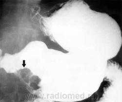 Рентгенография хорошо выявляет последствия язвенной болезни - участки рубцовой деформации желудка и 12-перстной кишки. Иногда язвы могут осложняться пенетрацией в окружающие органы (поджелудочную железу, печеночно-дуоденальную связку, сальник, печень и желчные пути), а также в брюшную полость. В этом случае при обзорной рентгенографии или при выполнении снимка на правом боку (латерография) выявляется свободный воздух в брюшной полости, указывающий на перфорацию полого органа. Следует заметить, что при подозрении на перфорацию одного из органов пищеварительного канала противопоказан прием бария. Для контрастирования органов пищеварительного канала в этом случае используют водорастворимые йодсодержащие контрастные вещества. Диагностика перфораций и сопутствующих им осложнений возможна также с помощью УЗИ и КТ.