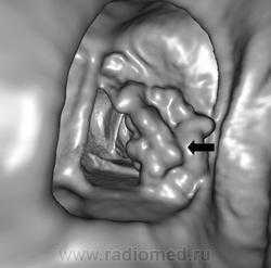 Ирригоскопия по-прежнему является одним из важнейших методов исследования всех отделов толстой кишки. Она дополняет данные колоноскопии и позволяет получить более полную информацию о состоянии органа. Одно из самых частых показаний к ирригоскопии – диагностика рака толстой кишки, полипов и дивертикулов. При ирригоскопии рак толстой кишки виден как дефект наполнения с четкой границей между неизмененной слизистой оболочкой и опухолью; выявляются признаки ригидности кишечной стенки. Нередко участок опухолевого поражения вызывает циркулярное сужение просвета кишки (симптом «яблочного огрызка»). Рентгенологические проявления рака толстой кишки зависят от гистологической формы опухоли, локализации и степени ее распространения. МСКТ и в особенности методика КТ-колонографии могут служить альтернативой ирригоскопии в скрининге и диагностике рака толстой кишки. КТ позволяет лучше видеть изменения кишечной стенки и стадировать заболевание.