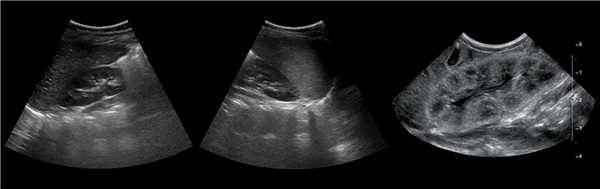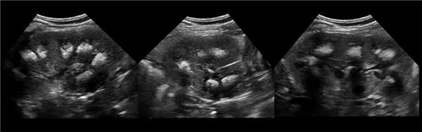 • Две центральных гиперэхогенных почечных пазухи, разделенные промежуточной соединительной почечной паренхимой