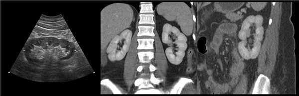 Рисунок. На УЗИ (1) и КТ (2, 3) контур почек волнистый. У эмбриона почка развивается из отдельных долек, которые сливаются по мере их роста. Дольчатое строение почек хорошо видно у плода и новорожденных, в единичных случаях сохраняется у взрослых.