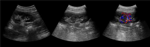 Рисунок. На УЗИ синус почек широкий, неоднородной эхоструктуры (1, 2). На фоне гиперэхогенного жира гипоэхогенный очаг округлой формы (2), при ЦДК междолевые сосуды проходят через гипоэхогенную зону без смещения (3) — это гипоэхогенный жир. При ожирении липоматоз синуса можно ошибочно принять за атрофию паренхимы.