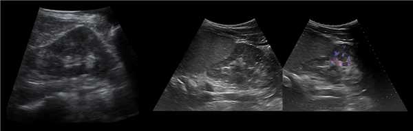 Рис. 3. Мелкий дивертикул верхней чашечки правой почки с симптомом "кальциевого молока" на эхограммах и при цветном допплеровском картировании: