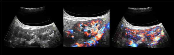 Рисунок. На УЗИ в малом тазу (мочевой пузырь — акустическое окно) определяются почки связанные узким перешейком (1, 3); дифференцировка паренхимы сохранена, кровоток прослеживается до капсулы (2, 3). Заключение: Аномалия взаиморасположения почек — сращение нижних полюсов тазово-дистопированных почек.