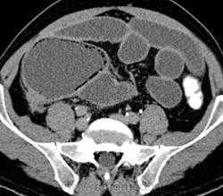 Как уже упоминалось, для исследований тонкой кишки используют оценку пассажа по ней бариевой взвеси или водорастворимого контрастного средства, а также чреззондовую энтерографию. В последнее время большое внимание привлекли такие методики, как КТ- или МР-энтерография, при которых возможно построение трехмерных изображений органа и построение изображений просвета кишки в эндоскопическом режиме. Опухоли тонкой кишки, по сравнению с выше- и нижележащими отделами пищеварительного канала, встречаются редко. При лучевом исследовании этого органа частым показанием к исследованию является диагностика тонкокишечной непроходимости и выяснение ее причины, выявление локальных воспалительных поражений (чаще всего - терминального отдела при болезни Крона), обследование пациентов с синдромом «острого живота». При подозрении на острую тонкокишечную непроходимость выполняют обзорный снимок брюшной полости