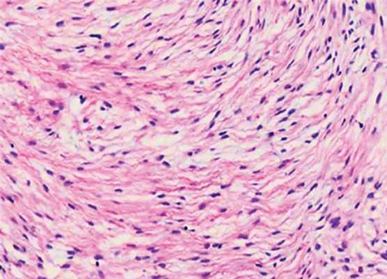 Фрагменты опухоли, характеризующейся упорядоченной структурой пучков коллагена (1) и расположенными между ними фибробластами (2) с умеренным полиморфизмом. Окраска гематоксилином и эозином, ув. ×200.