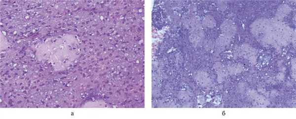 Рис. 4. Фотографии микропрепаратов десмопластической фибромы. а — очаги миксоматоза, гиалиноза; б — единичные оссификаты, включенные в ткань опухоли. Окраска гематоксилином и эозином.