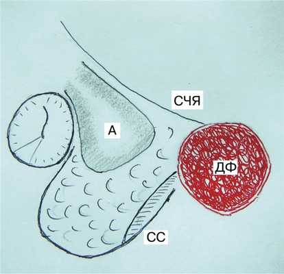 Рис 3. Схема интраоперационного расположения образования в левом сосцевидном отростке. А – антрум, СС – сигмовидный синус, СЧЯ – средняя черепная ямка, ДФ – десмопластическая фиброма.