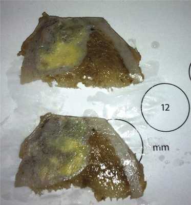 Рис. 5. При макроскопическом исследовании поражение четко ограничено, желтовато-серого цвета.