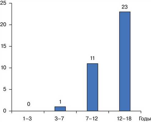 Возраст больных варьировал от 7 до 18 лет, наибольшее количество наблюдений отмечалось в возрасте от 12 до 18 лет. Распределение по возрасту показано на рис. 1.