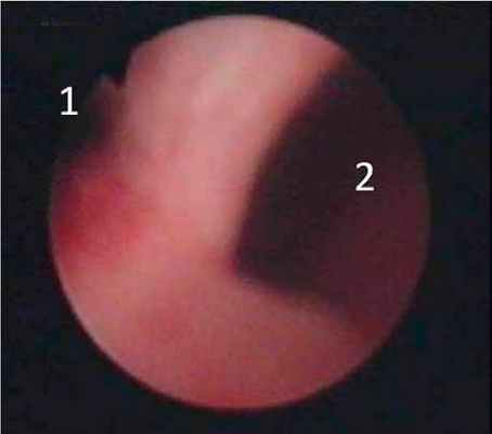 | Рисунок 4. Уретроцистоскопия. 1 – ход уретры. 2 – устье дивертикула. |
