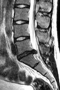 МРТ поясничного отдела позвоночника. Сагиттальная Т2-взвешенная МРТ. Грыжа диска.