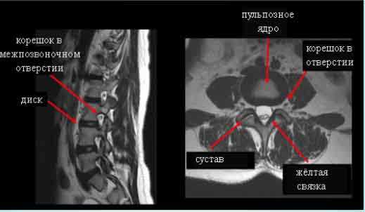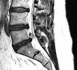 Передние и переден-латеральные грыжи, хорошо видимые на сагиттальных МРТ позвоночника, вызывают раздражение хорошо иннервированной передней продольной связки, что приводит болевому синдрому в пояснице.