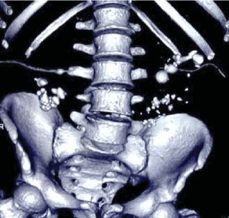 Поэтапно выполнена перкутанная нефролитотомия с обеих сторон. Конкременты удалены полностью. На фоне билатерально установленных внутренних мочеточниковых стентов добиться регрессии кистозных элементов не удалось. Произведен поочередно полная эндоскопическая аблация кист мочеточников гольмиевым лазером (Ho:YAG) с диаметром волокна 365 μm, энергией 700 mJ и частотой 12 Hz. В послеоперационном периоде верхние мочевые пути дренировали внутренними мочеточниковыми стентами в течение 1-го месяца, после удаления которых восстановлен физиологический пассаж мочи по верхним мочевым путям. Несмотря на сохраняющуюся билатеральную гидронефротическую трансформацию (рис. 5), по данным динамической нефросцинтиграфии, отмечено умеренное нарушение накопительно-выделительной функции почек без признаков значимой обструкции. Уровень азотистых оснований сыворотки крови также оставался в пределах референтных значений.