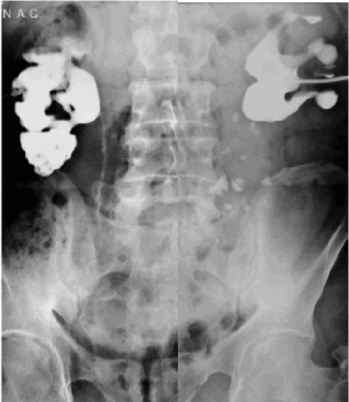 (Слева) Внутривенная пиелография в экскреторную фазу, прямая проекция: несколько пристеночных дефектов наполнения небольших размеров в левом мочеточнике, в проксимальном его отделе и в середине. Эти признаки характерны для кистозного уретерита.