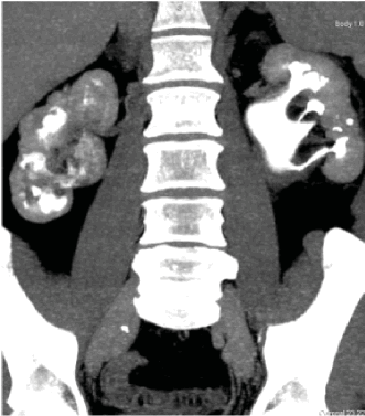 (Справа) КТ-урография, реконструкция в плоскости наибольшей интенсивности, корональный срез: у пожилого мужчины с дизурией и предшествующими эпизодами инфекции вдоль правого мочеточника определяются несколько дефектов наполнения с ровным контуром На эндоскопии выявлено, что данные образования находятся в подслизистом слое, а в образцах биопсии отсутствовали признаки переходноклеточного рака.