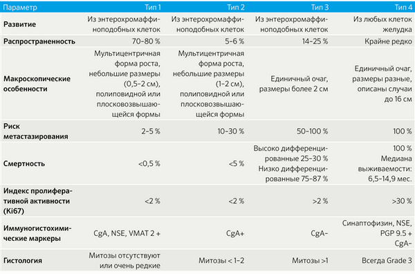 Таблица 1. Характеристика клинико-патологических форм НЭО желудка [3,4]