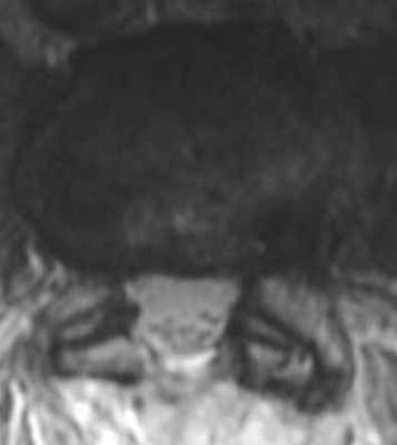 МРТ поясничного отдела позвоночника. Рецидивная грыжа диска. Т2-зависимые МРТ в сагиттальной и аксиальной плоскостях.