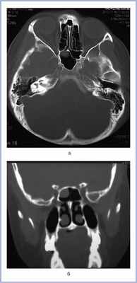 В апреле 2010 г. в связи с затянувшейся острой респираторной инфекцией пациентке была назначена КТ околоносовых пазух; подтверждено наличие кистоподобного образования, которое увеличивалось в размерах (рис. 2, а, б).