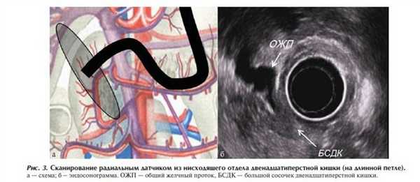 В некоторых наблюдениях для более детального осмотра терминального отдела ОЖП сканирование выполняли из постбульбарного отдела в положении аппарата на "длинной петле" (рис. 3 ). У всех пациентов оценивали диаметр протока, наличие и характер утолщения стенки, включения в просвете ОЖП и их ультразвуковую структуру, внешний и внутренний контур протока, а также увеличение регионарных лимфоузлов.