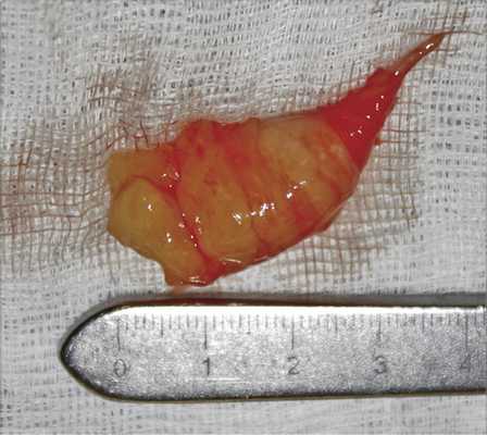 Интраоперационно после поверхностной паротидэктомии по заднему полюсу железы была обнаружена неоднородная инкапсулированная опухоль желтого цвета, напоминающая липому, мягкоэластической консистенции, размером 20×14×35 мм, вовлекающая ствол лицевого нерва у его выхода из шилососцевидного отверстия до отхождения основных его ветвей. Опухоль имела веретенообразную форму и истончалась по направлению к фаллопиевому каналу. Хирургом была предпринята попытка выделить плотно спаянную с оболочкой нерва опухоль, тем не менее во время диссекции перерастянутый опухолью ствол лицевого нерва был поврежден и потерян в фаллопиевом канале (рис. 3). Рис. 3. Интраоперационный вид опухоли после выделения из ткани околоушной слюнной железы.