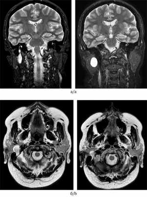 После ретроспективного анализа литературы, посвященной данному вопросу, и тщательного пересмотра предоперационных МРТ-изображений пациентки О. стало очевидным, что метод ядерной МРТ на данный момент является ключевым методом выявления шванномы ввиду того, что он позволяет определить немногочисленные, но специфические МРТ-признаки шванномы лицевого нерва и дополнить диагностический алгоритм.
