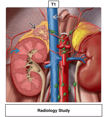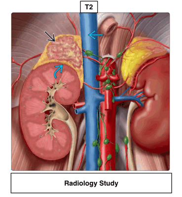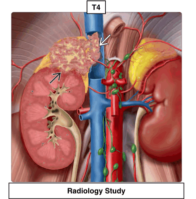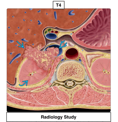 - Т4 - опухоль любого размера с инвазией в органы брюшной полости и забрюшинного пространства (печень, поджелудочную железу, почки, нижнюю полую вену и др.).