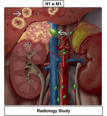 - N1 – обнаруживаются метастазы в паракавальные и парааоротальные лимфоузлы