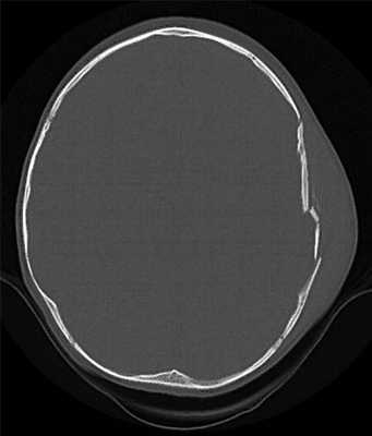 а) Признаки перелома черепа на КТ и МРТ. С помощью компьютерной томографии можно диагностировать три типа перелома черепа: линейные, вдавленные и диастатические. Для визуализации линейных переломов и малых трещин используются алгоритмы реконструкции и фильтры. Переломы черепа могут сопровождаться сопутствующей внутричерепными измененями: гематомами, ушибами, пневмоцефалией или наличием инородных тел, которые могут быть так же выявлены с помощью КТ. Если при переломе имеются раны мягких тканей покровов черепа, то он называется «открытым», так как возникает потенциальная связь между внутричерепным пространством и окружающей средой. В противном случае он называется «закрытым».