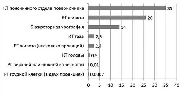 Большинство диагностических процедур, основанных на воздействии ионизирующего излучения (рентгенологическое обследование, флюорография), характеризуются дозировкой излучения менее 50 мГр (см. рисунок) Поглощаемая плодом доза ионизирующего излучения при проведении рентгенологических исследований (мГр) [8]. (например, доза для плода при рентгенографии грудной клетки составляет менее 1 мкГр, при флюорографии — 1,5 мкГр), поэтому даже при проведении нескольких рентгенологических исследований подряд вероятность неблагоприятного воздействия на плод крайне низка. Так, компьютерная томография (КТ) характеризуется довольно высокой дозой излучения (поскольку проводится серия рентгеновских снимков, излучение, сопровождающее каждый из них, суммируется). Поэтому К.Т. во время беременности должно выполняться по строгим показаниям, хотя риск для плода также невысок. Согласно современным рекомендациям, этот метод исследования имеет свою нишу при беременности. КТ рекомендуют проводить при сомнении в диагнозе острый аппендицит, подозрении на тромбоэмболию легочной артерии, при серьезных травмах, а в некоторых случаях и при необходимости уточнения строения и формы таза. При этом во всех случаях перед проведением этой процедуры с пациенткой необходимо провести беседу и информировать ее о потенциальных рисках для плода, получив с нее информированное согласие на манипуляцию [8].