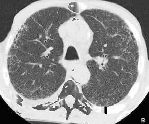 Констриктивная форма бронхиолита – итог всех видов заболевания. Развивается необратимый фиброз с концентрическим сужением бронхиолы. Фиброз распространяется вдоль бронхиолы, нарушает коллатеральную вентиляцию, вызывая обструкцию. Сужение просвета бронхиолы приводит к гипоксии, вазоконстрикции, возникновению первоначально воздушных подушек” (клапанный механизм), а затем ателектаза дольки. При КТ регистрируется “пестрая” картина легочной ткани за счет чередования участков повышенной и пониженной плотности, бессистемно чередующихся друг с другом. Это обусловлено нарушением кровотока в области констрикции бронхиолы, олигемией в данной зоне и перераспределением перфузии в зоны с ненарушенной вентиляцией. При КТ эти зоны имеют повышенную прозрачность. Мозаичность изменений плотности легкого лучше видна при сканировании одной и той же области легкого на вдохе и выдохе, так как вентиляция патологически измененной части легкого не меняется в различные фазы дыхания. При значительном распространении изменений, обусловленных обструктивным бронхиолитом, разница в плотности различных участков легочной ткани на вдохе и выдохе нивелируется, оставаясь одинаковой независимо от фазы дыхания.