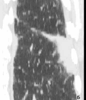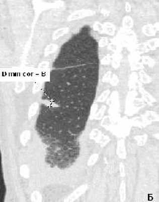 А - аксиальный срез на уровне нижних долей легких, выявлены участки диффузного снижения пневматизации по типу «матового стекла», в нижней доле справа выявлена субплевральная консолидация неправильной округлой формы. Б - МПР правого легкого в коронарной проекции на уровне консолидации. Рассчитанное значение 3 D – коэффициента составило 3.43 ( D max axial / D min cor = А/В =3.43), свидетельствующее в пользу доброкачественности консолидации. При трансторакальной биопсии консолидации получены клетки воспаления (макрофаги, незрелые фибробласты), внутриальвеолярные конгломераты соединительной ткани с лимфоцитарной инфильтрацией.