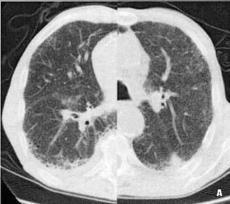 За счет фиброза развивается центрилобулярная эмфизема [8]. При КТ определяются двусторонние, диффузные мелкоочаговые и линейные уплотнения (как при целлюлярной форме бронхиолита), утолщение стенок мелких бронхиол, дилатация просвета, поля “матового стекла” по периферии легкого, чередующиеся с участками центрилобулярной эмфиземы. Поражается практически все легкое (рис. 5).