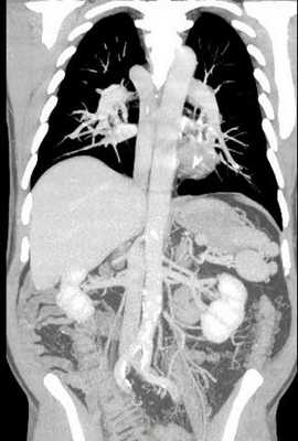 Рис.3. СКА сосудов брюшной и грудной полостей (справа – фронтальный, слева - сагиттальный срез). Аплазия предпочечного и печеночного отделов нижней полой вены с дренированием в непарную вену, полиспления.