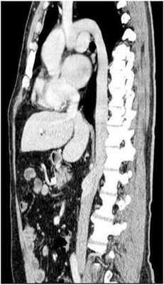 - Непарная вена (продолжение нижней полой вены) расширена, находится позади аорты