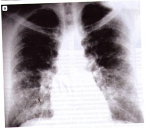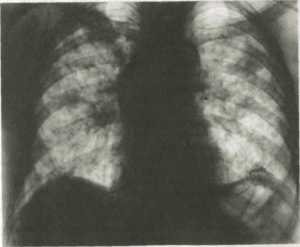 Гиперчувствительный альвеолит – это заболевание, возникающее у хлопкоробов, тростниководов, зерноводов, табаководов, скорняков, сыроделов, производителей пеньки, сотрудников овощехранилищ и другими соединениями, способными вызывать реакции гиперчувствительности. Специфическим проявлением заболевания на рентгеновском снимке является появление инфильтративных теней, которые возникают короткое время. При патологии появляются специфические лабораторные изменения – увеличение эозинофилов или базофилов крови. Случаи экзогенного аллергического альвеолита появляются под действием металлов (цинк, медь, мышьяк, золото, кобальт). Растительные инсектициды также вызывают аллергические альвеолиты. При выявлении на рентгенограмме инфильтрации в проекции сегмента, доли или целого легкого, увеличении эозинофиллов в общем анализе крови следует предполагать аллергическую (гиперчувствительную) форму. Подтверждением результата является быстрое исчезновение рентген признаков пневмонии самостоятельно после ликвидации аллергена или лечении стероидными противовоспалительными препаратами (преднизолон, гидрокортизон). При морфологическом обследовании легких у работников фермерских хозяйств обнаруживается специфическая картина острого или хронического альвеолита. При иммуноферментном анализе крови выявляются преципитирующие антитела к экстрактам сена. Аллергические реакции 3,4 типа выявляются при экзогенном аллергическом пневмоните. Ведущая роль в патогенезе патологии принадлежит целым иммунным комплексам, вызывающим многочисленные изменения организма с участием клеток системы комплемента, альвеолярных макрофагов. Данные клетки выделяют хемотоксины, интерлейкин-2, активные кислородные радикалы, которые способствуют образованию коллагена, росту фибробластов. Результатом патологии является альвеолобронхиолит, при котором формируются гранулемы, последовательно развивается фиброзное преобразование легочной ткани с поражением интерстиция. Фото рентген снимка при аллергическом альвеолите Для экзогенного аллергического альвеолита характерно образование химических веществ, появление ряда иммунных реакций, для которых формируется появление разных токсических поражений легочной паренхимы. При этой нозологической форме появляется экзогенное воспаление альвеол. Иммуноферментный анализ (ИФА) обнаруживает антитела к клеткам альвеолярной ткани. На серии рентгенограмм периодически прослеживаются инфильтративные очаги, которые не лечатся антибиотиками.