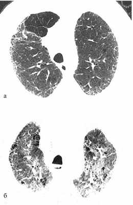 В качестве примера быстрого прогрессирования ИФЛ приводятся данные компьютерной томографии (КТ) больного в дебюте болезни (а) и через 4 мес (б) (рис. 1).